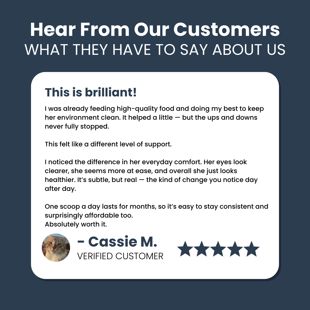 Some cat parents notice changes — like steadier energy, clearer eyes, or overall comfort — within a few weeks.