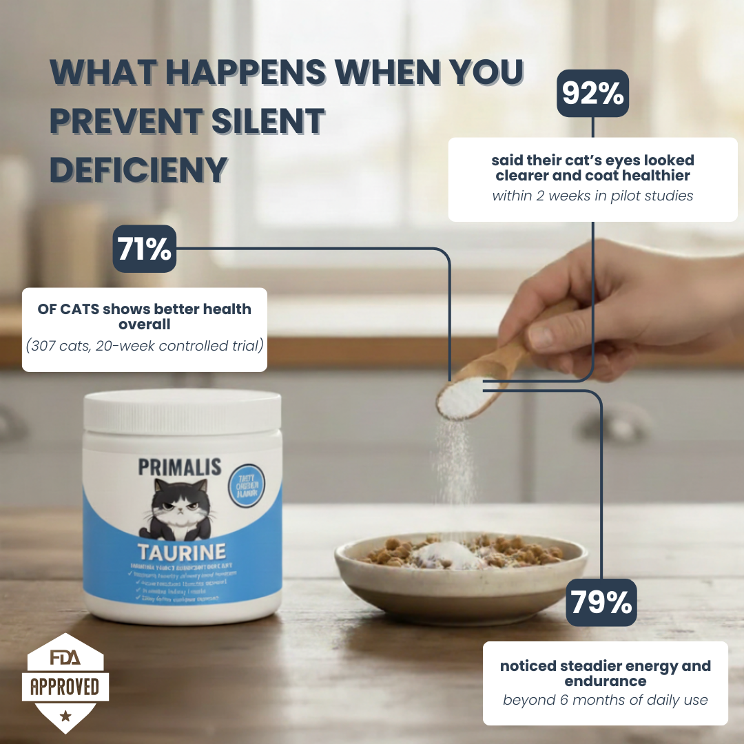 Primalis Taurine fills that hidden gap with targeted daily nutrition designed to support what your cat needs every single day — before anything feels off.